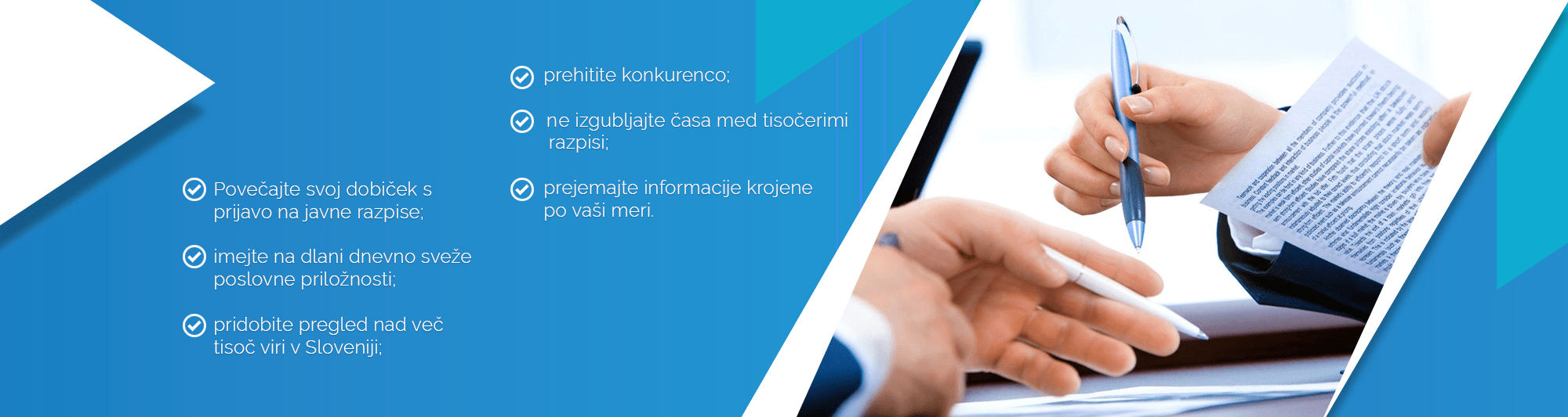 Vsak dan vas bomo obvestili o novi poslovni priložnosti. Imeli boste pregled nad več kot tisoč viri obveščanja, in pred vašimi očmi se bodo znašli samo tisti razpisi, ki so primerni za vas. Na enem mestu bo za vas dosegljivo besedilo razpisa in pripadajoči obrazci. Vaša prijava na razpis ne bo nikoli lažja.